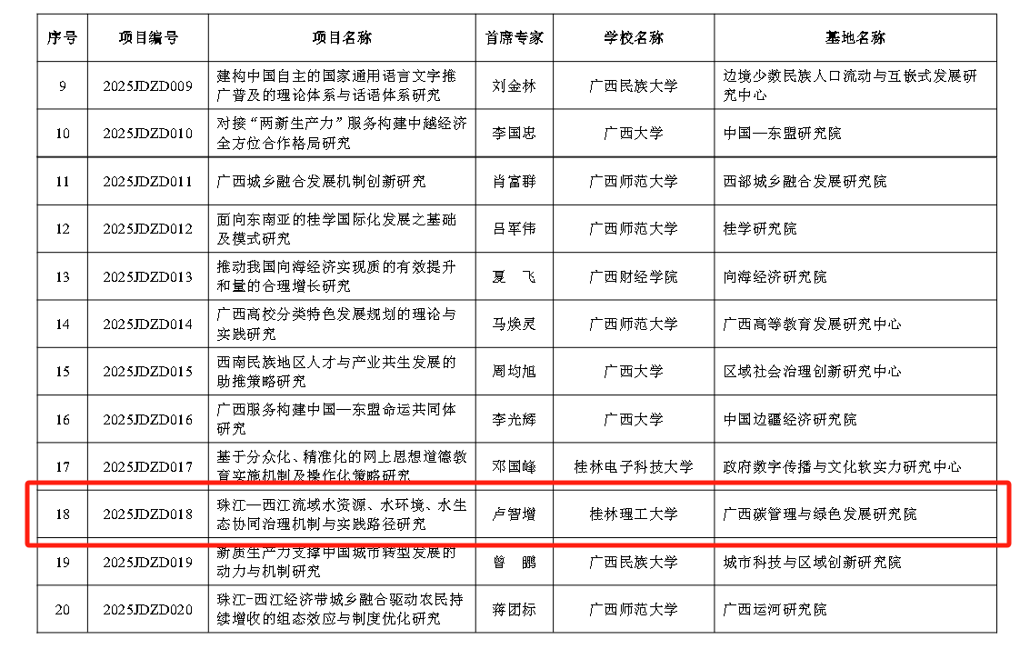 近日,广西壮族自治区教育厅公布了2025年广西高校人文社科重点研究基地重大项目名单(桂教科研〔2025〕15号)。由广西碳管理与绿色发展研究院负责人卢智增教授主持申报的《珠江——西江流域水资源、水环境、水生态协同治理机制与实践路径研究》获批立项。该项目紧密围绕美丽中国建设和人与自然和谐共生的现代化战略需求,针对流域“三水”统筹治理难题,致力于构建科学、可行的“三水”协同治理机制与实践路径。项目预期通过深...