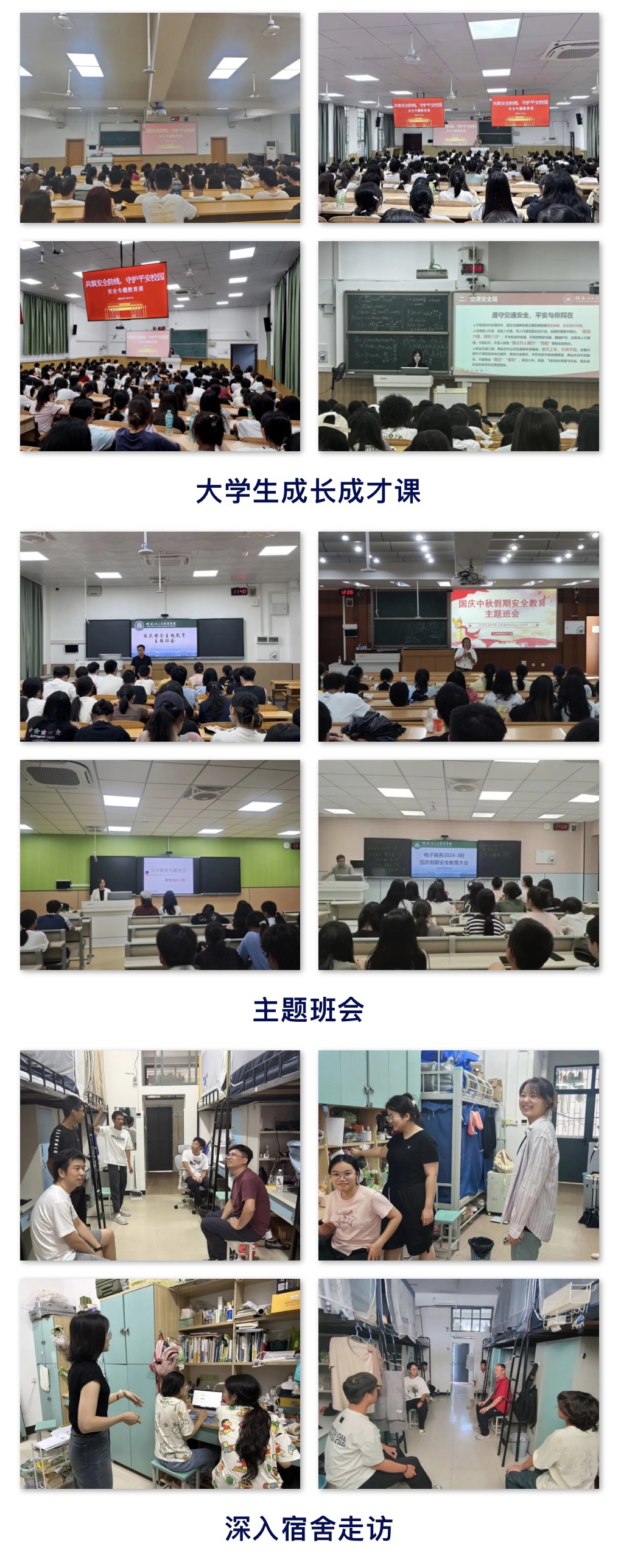 为切实做好国庆、中秋假期安全稳定工作,进一步增强学生安全防范意识,营造安全、文明、和谐的校园环境,学院于9月25日—30日,通过多种形式开展安全主题教育,为学生的假期安全保驾护航。学院以大学生成长成才课、主题班会为阵地,重点从假期学生管理规定、人身安全、交通安全、财产安全、出行安全、网络安全、宿舍安全、饮食安全、防火防盗、电信诈骗、防溺水等方面进行教育,切实增强学生安全防范意识。辅导员、班主任深入宿...